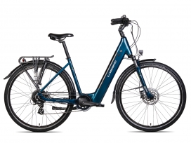 Ekonomiczny w zakupie ośmiobiegowy rower miejski na kołach 28" wyposażony w elektryczny układ wspomagania w tylnej piaście renomowanej firmy BAFANG. Amortyzowany widelec przedni, kompletny osprzęt klasy SHIMANO ACERA/ALTUS, opony SCHWALBE z wkładką antyprzebiciową. Błotniki, bagażnik i oświetlenie diodowe to uzupełnienie wyposażenia roweru. Zasięg przy wykorzystaniu wspomagania to od 70 do 120 km w zależności od zastosowanego trybu jazdy. Bateria 522Wh. Rower wyposażony w kolorowy cyfrowy wyświetlacz informujący o podstawowych parametrach jazdy i baterii (aktualna prędkość, stopień wspomagania, zasięgi na poszczególnych trybach itp).